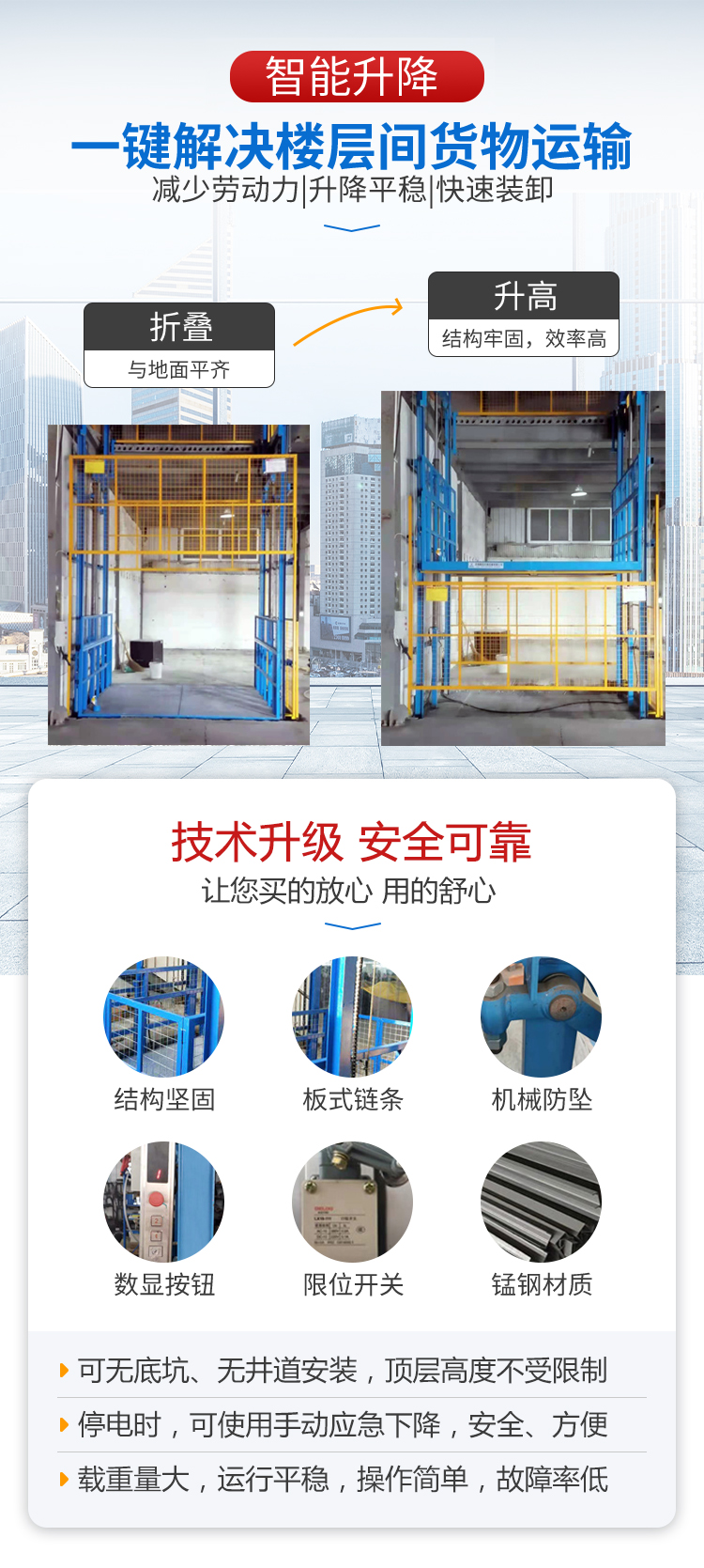 液壓升降貨梯安裝環(huán)境不受限制,無需地坑和機房,室內(nèi)外均可安裝,特別適合于有多層工業(yè)廠房、倉庫、超市等多樓層間的貨物運輸。