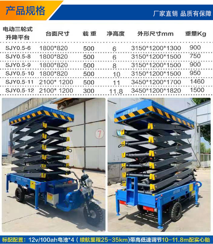三輪車升降平臺是一種移動靈活的高空作業(yè)的升降平臺,行走方式和升降方式均為電瓶驅(qū)動,舉升機構(gòu)采用高強度錳鋼鉅形管制作。設(shè)有防止升降機超載的安全保護裝置。設(shè)有防止液壓管路破裂的安全保護閥。設(shè)有停電情況下的應(yīng)急下降裝置。